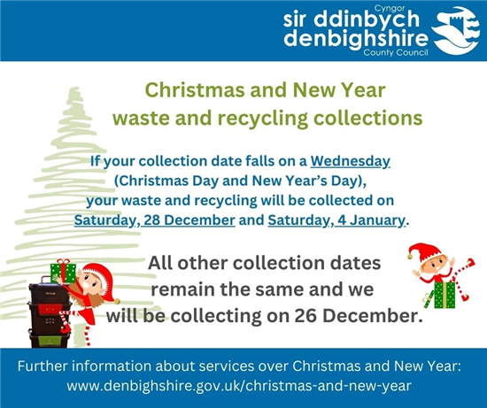 For more information, go to: https://www.denbighshire.gov.uk/en/contact-us/christmas-and-new-year-information.aspx