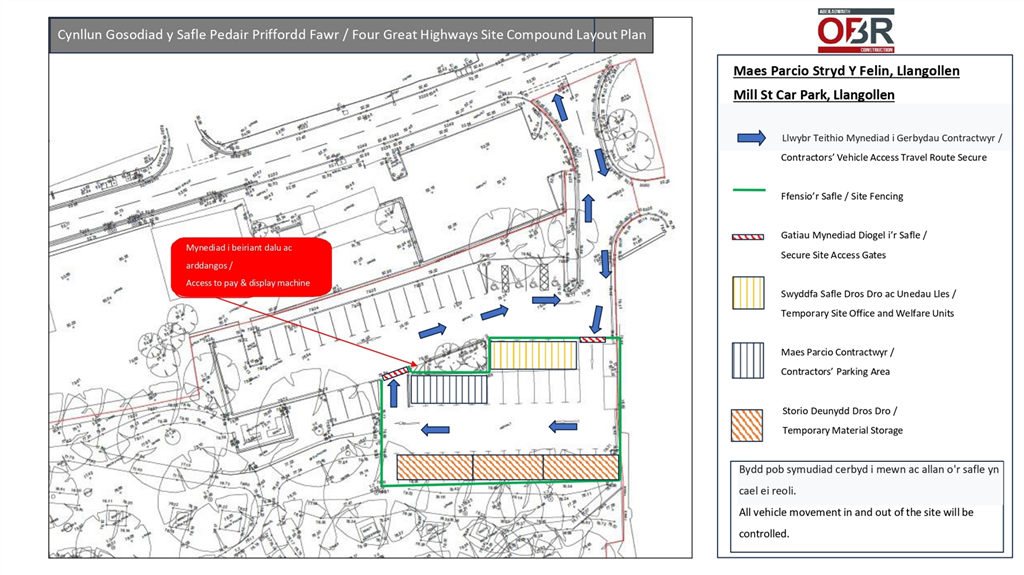 Mill Street car park in Llangollen will be partially closed for a 5 month period to provide a site compound for contractors to undertake construction work for the Council’s Four Great Highways project.