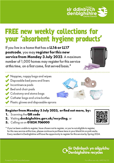 Denbighshire’s new Absorbent Hygiene Products (AHP) collections will be launched in a pilot scheme from September 2023.