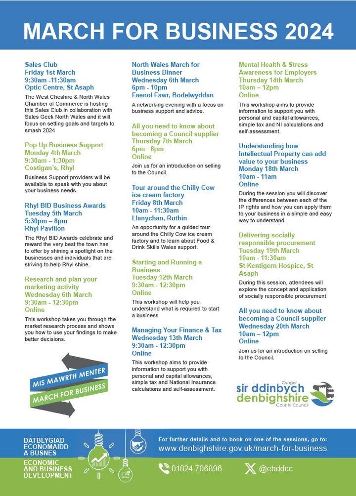 The March for Business campaign is back for 2024, providing free workshops, networking events and advice sessions for businesses across Denbighshire.