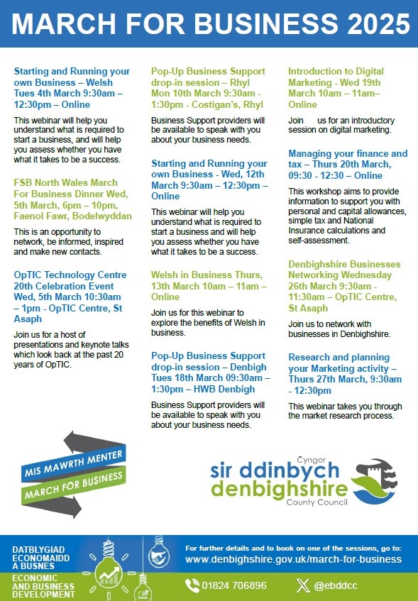 These events will be comprised of a mixture of networking events and workshops and will be hosted at various locations across the county as well as online and will offer professional and valuable advice and resources for free to Denbighshire’s local businesses.