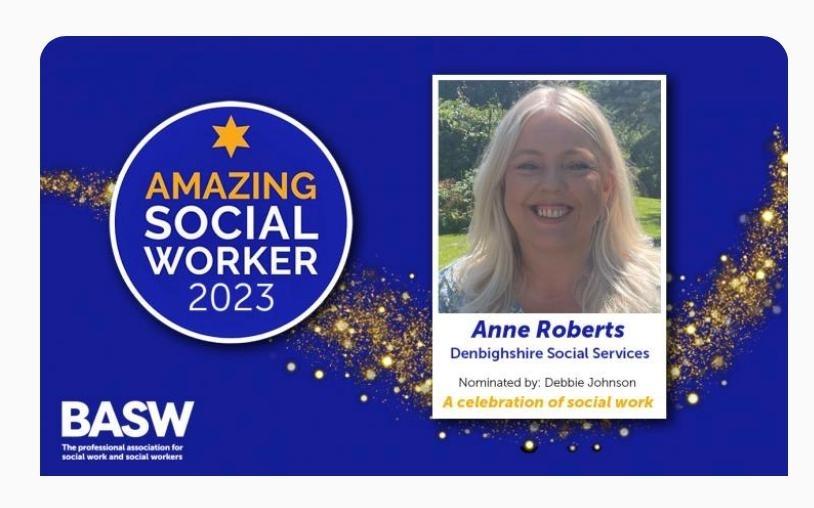 "Our social workers in Denbighshire work extremely hard, so I am very pleased to see that this dedication has been recognised by the British Association of Social Workers. A huge congratulations to Anne for this incredible accomplishment”.
