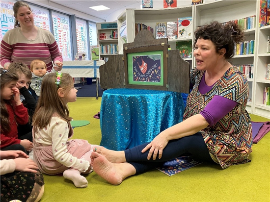 The author Leisa Mererid leading a well-being session with families at Denbigh and Prestatyn Libraries