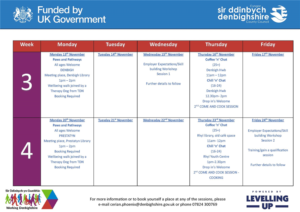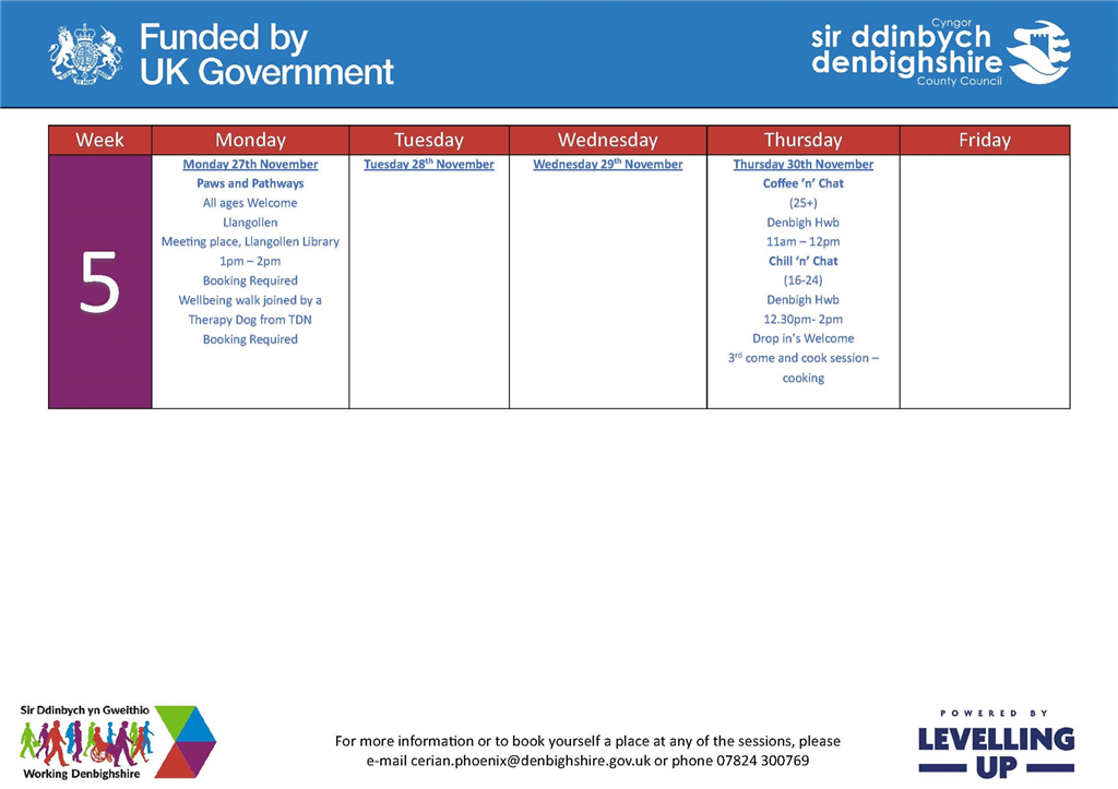 Booking is required and can be done by sending an email to cerian.phoenix@denbighshire.gov.uk or calling 07824 300769.